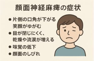 顔面神経麻痺とは、顔の表情をつかさどる「顔面神経」が障害されることで、顔の片側が動きにくくなる病気です。顔面神経は、まばたきや笑顔、口の開閉などをコントロールするほか、涙や唾液の分泌、味覚の一部にも関わっています。そのため、障害が生じると多彩な症状が現れます。