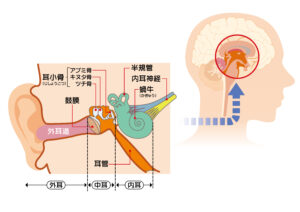 音は空気の振動で外耳から中耳を経由します。中耳にある鼓膜や耳小骨で音波の振動を増幅させ内耳へ伝えます。そこから内耳にある蝸牛には聴覚受容器であるコルチ器の有毛細胞により電気信号に変換され蝸牛神経が興奮し中枢へ伝わります。